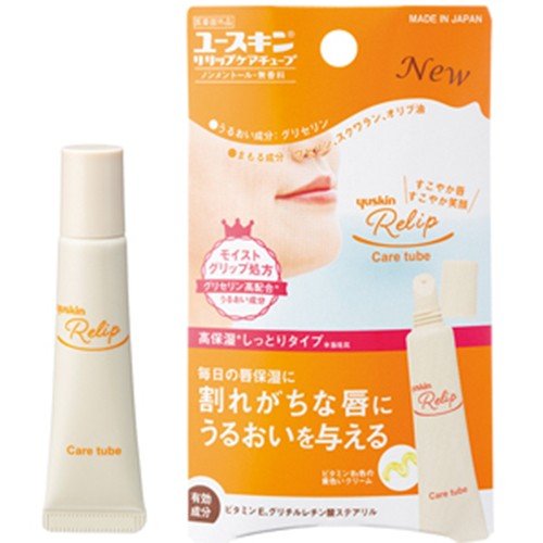 毎日の唇保湿に、割れがちな唇にうるおいを与えてくれる ユースキン リリップ ケアチューブ!2つの有効成分が唇あれを防ぎ、ワセリンが唇をまもり、グリセリンがうるおいを与えるモイストグリップ処方。斜めカットのチューブで唇に塗りやすい構造になっています。高保湿のしっとりタイプなので、唇の荒れが気になる方にオススメの薬用リップです。