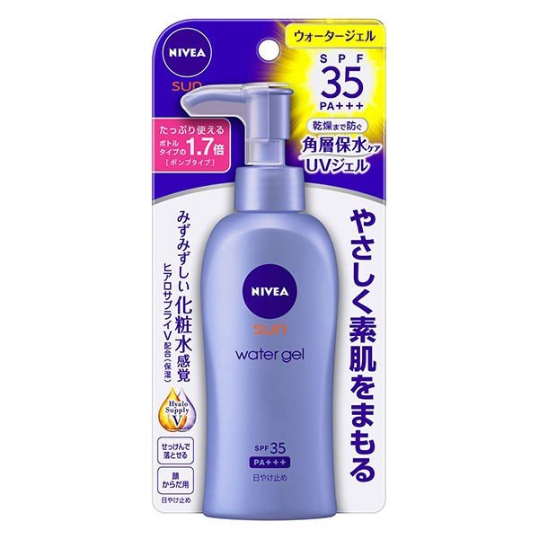 ニベアサンのプロテクトウォータージェルポンプは日常の紫外線対策の日焼け止めです。無香料・無着色で化粧下地としても使え、いつもの洗顔料で落とせます。スーッと伸びてべたつき・白残りなく、化粧水感覚で顔にもからだにもさっぱり使えるUVジェルタイプ。紫外線を浴びてカサついた肌にうるおいを与え、乾燥から肌を守ります。うるおい成分ヒアルロン酸に、天然植物エキスを配合。