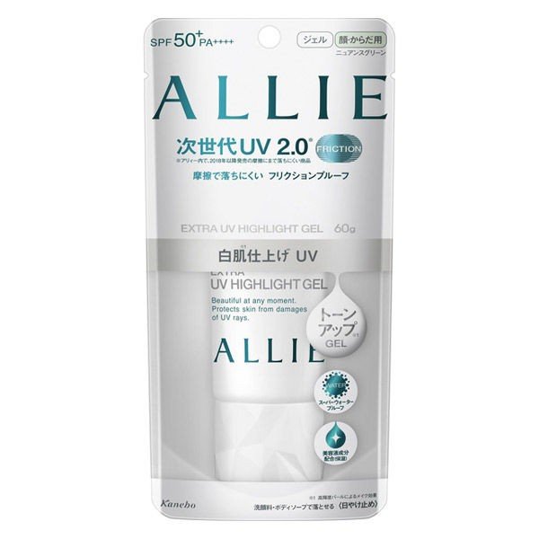 美容液成分保湿配合のアリィー エクストラUV ハイライトジェル!ヒアルロン酸+コラーゲンでいつもの洗顔料・ボディソープでやさしく落とせます。肌へのやさしさを考えた処方設計!また、80分間の耐水試験で確認済みとなる汗・水に強いスーパーウォータープルーフ機能搭載。そして、弾力性のあるジェルは摩擦の衝撃を受けても形状がくずれにくいのが特徴です。その為、摩擦に強く、日焼け止めが落ちにくいのが嬉しいポイント!肌へのやさしさを考えた処方設計の為、日常使いにはもちろん、海やプールにも大活躍する日焼け止めです。