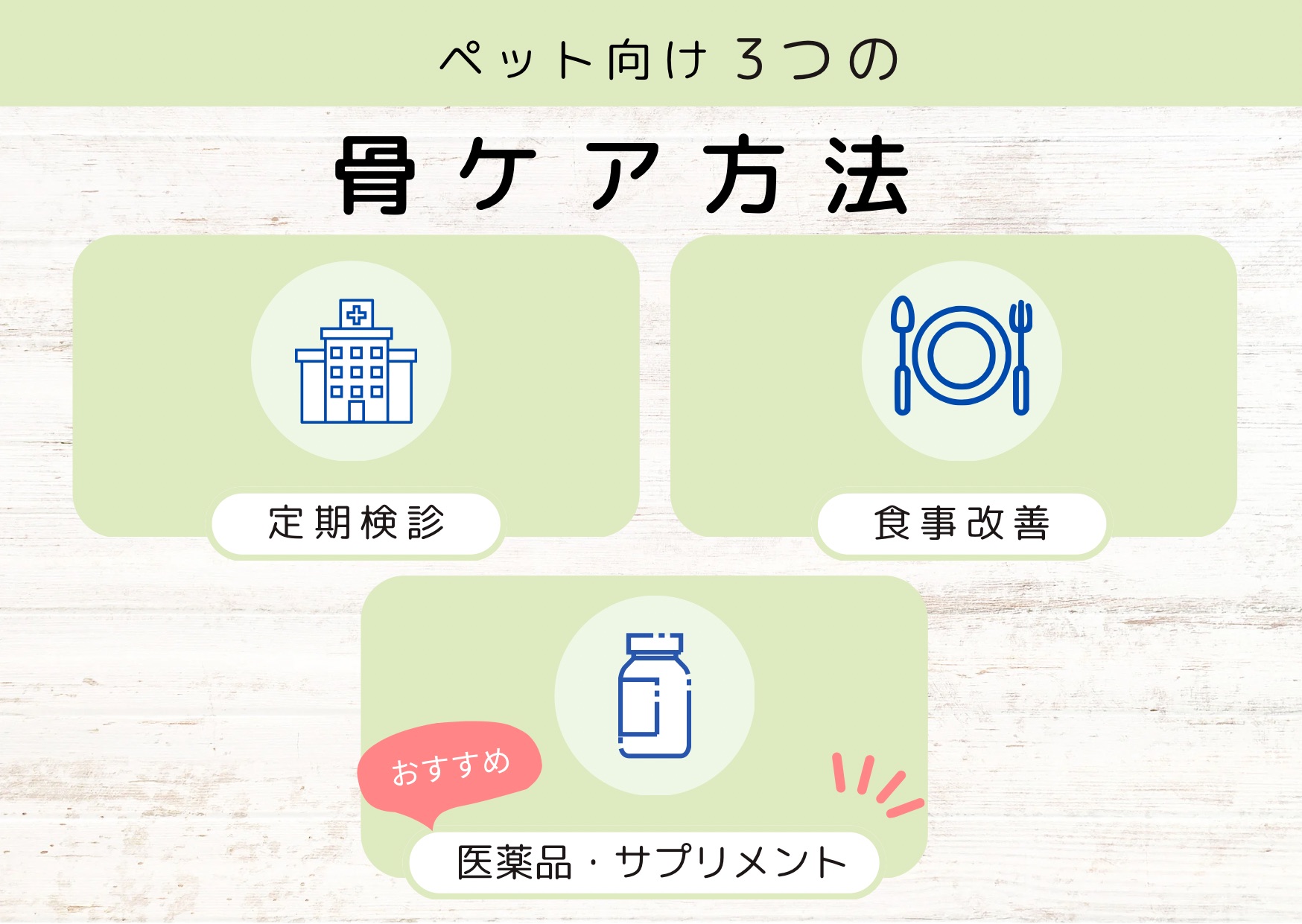 定期的な健康診断、カルシウムの摂取と合わせて、医薬品やサプリメントで内側からサポートすることで、骨粗しょう症、関節痛の予防となり、大切なペットを関節トラブルから守ることができます。