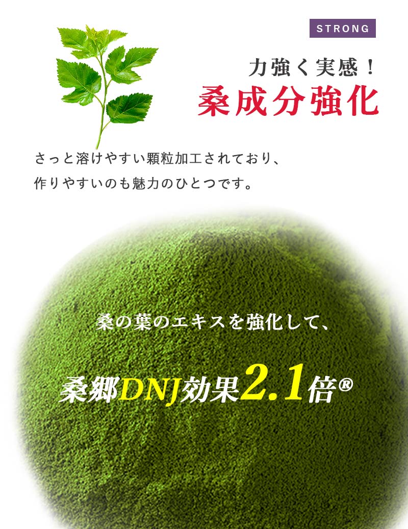 特許製法の沖縄産・希少ブランド品種「琉球しまぐわ RSD-1」を100%使用。最近の研究で、糖質コントロール成分の含有量No.1品種であり、ヒトの臨床試験の喜ばしい結果が学会発表された唯一の桑の葉茶です。沖縄の気候・土地だからこそ育つ行政指定農園での限定生産の品種改良品です。①沖縄の強い紫外線 → 植物は酸化から身を守る → 抗酸化成分が豊富になる ②沖縄は年中温暖な気候 → 植物は虫から身を守る → 糖コントロール成分が豊富になる ③沖縄は台風の多い島 → 植物は風雨から身を守る → 食物繊維が豊富にな