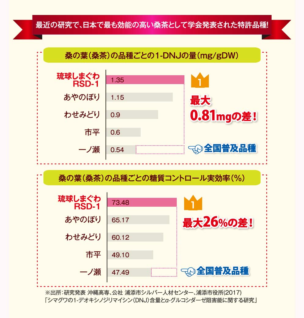特許製法の沖縄産・希少ブランド品種「琉球しまぐわ RSD-1」を100%使用。最近の研究で、糖質コントロール成分の含有量No.1品種であり、ヒトの臨床試験の喜ばしい結果が学会発表された唯一の桑の葉茶です。沖縄の気候・土地だからこそ育つ行政指定農園での限定生産の品種改良品です。①沖縄の強い紫外線 → 植物は酸化から身を守る → 抗酸化成分が豊富になる ②沖縄は年中温暖な気候 → 植物は虫から身を守る → 糖コントロール成分が豊富になる ③沖縄は台風の多い島 → 植物は風雨から身を守る → 食物繊維が豊富にな