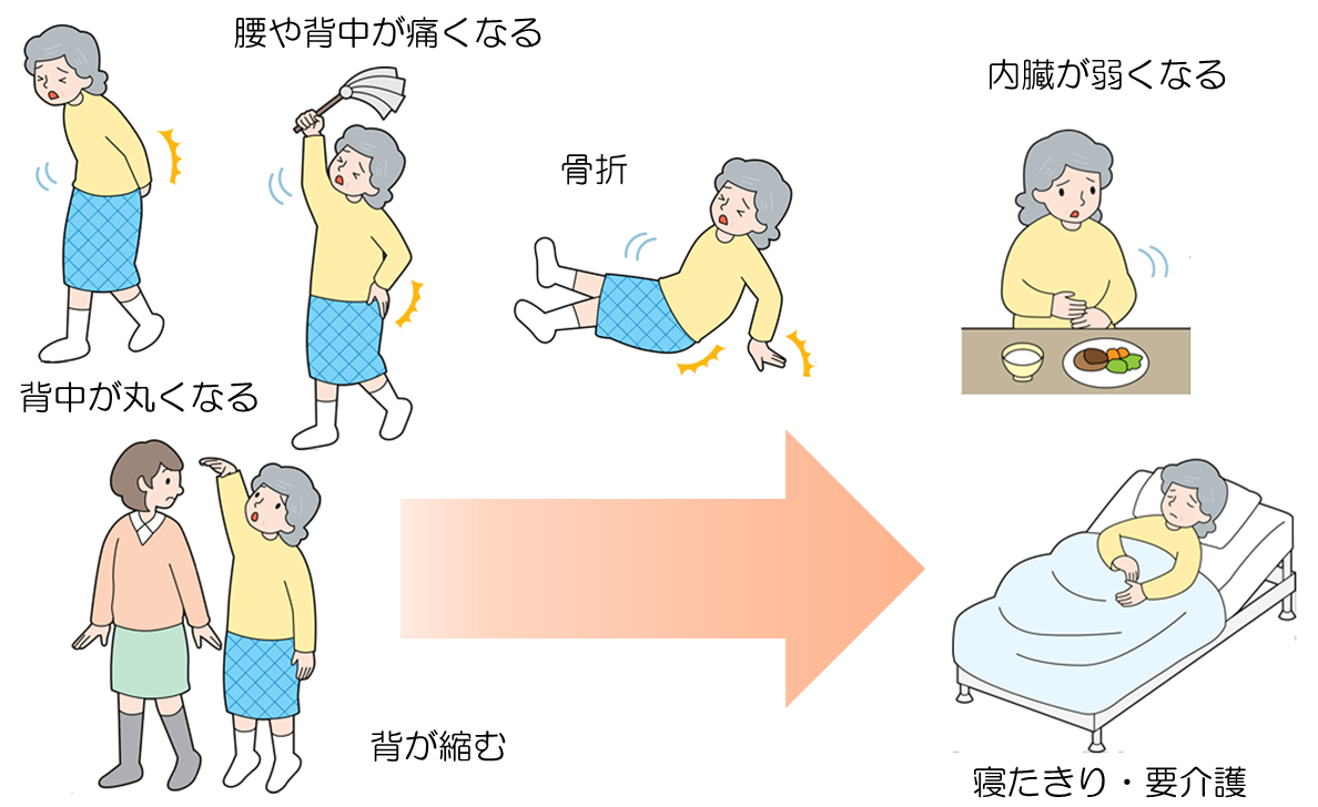 骨粗しょう症になると、背中や腰が曲がったり、わずかな衝撃で
