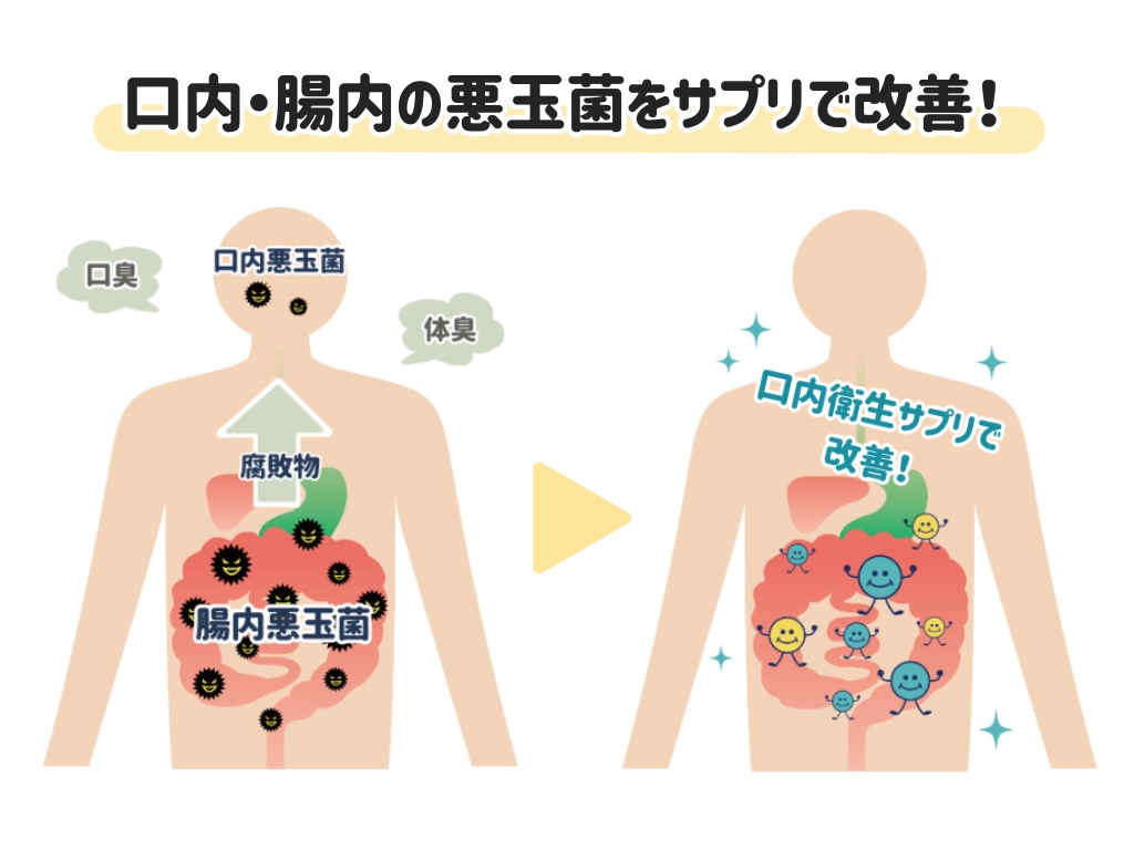 腸内で悪玉菌が増えることで腸の機能が低下して、腐敗物が溜まり、この腐敗物が原因で、体内のニオイや口臭などの問題が起こってしまいます。