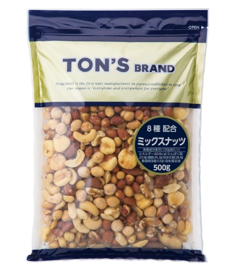 東洋ナッツのミックスナッツは、アーモンド、カシューナッツ、クルミの人気のナッツ3種に加え、大粒で希少なブラジルナッツも配合しています。おつまみの定番のピーナッツやジャイアントコーンも配合した8種類のミックスナッツ。500g入りのお得な業務用サイズの為、高コスパ!また、ナッツごとに、それぞれ適したロースト方法で作り上げている為、全てのナッツが一番美味しい状態で食べる事ができます。