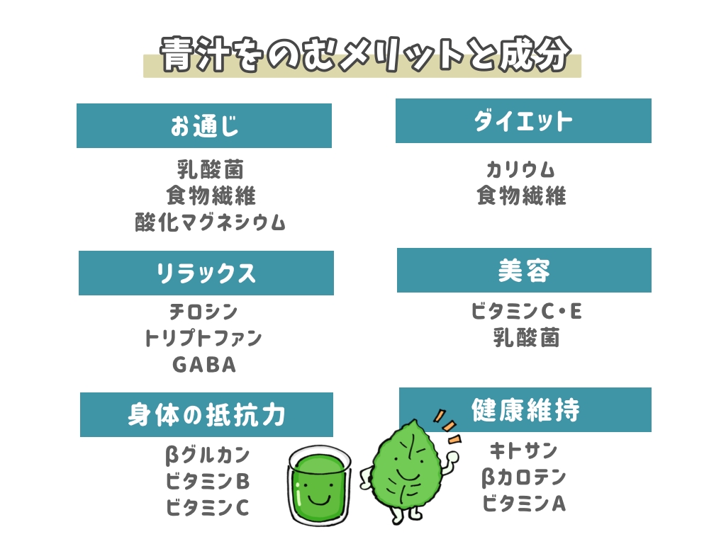ここでは、青汁をのむメリットとそれをサポートする成分をご紹介いたします。