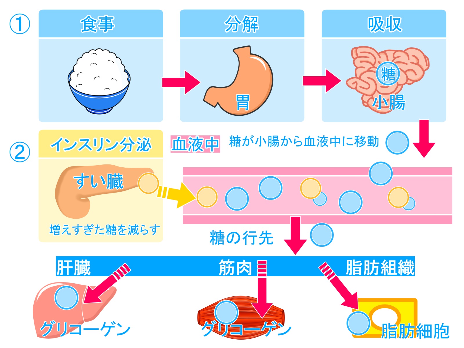 ①インスリンが分泌される量をコントロール=血糖値が上がるのを調整する