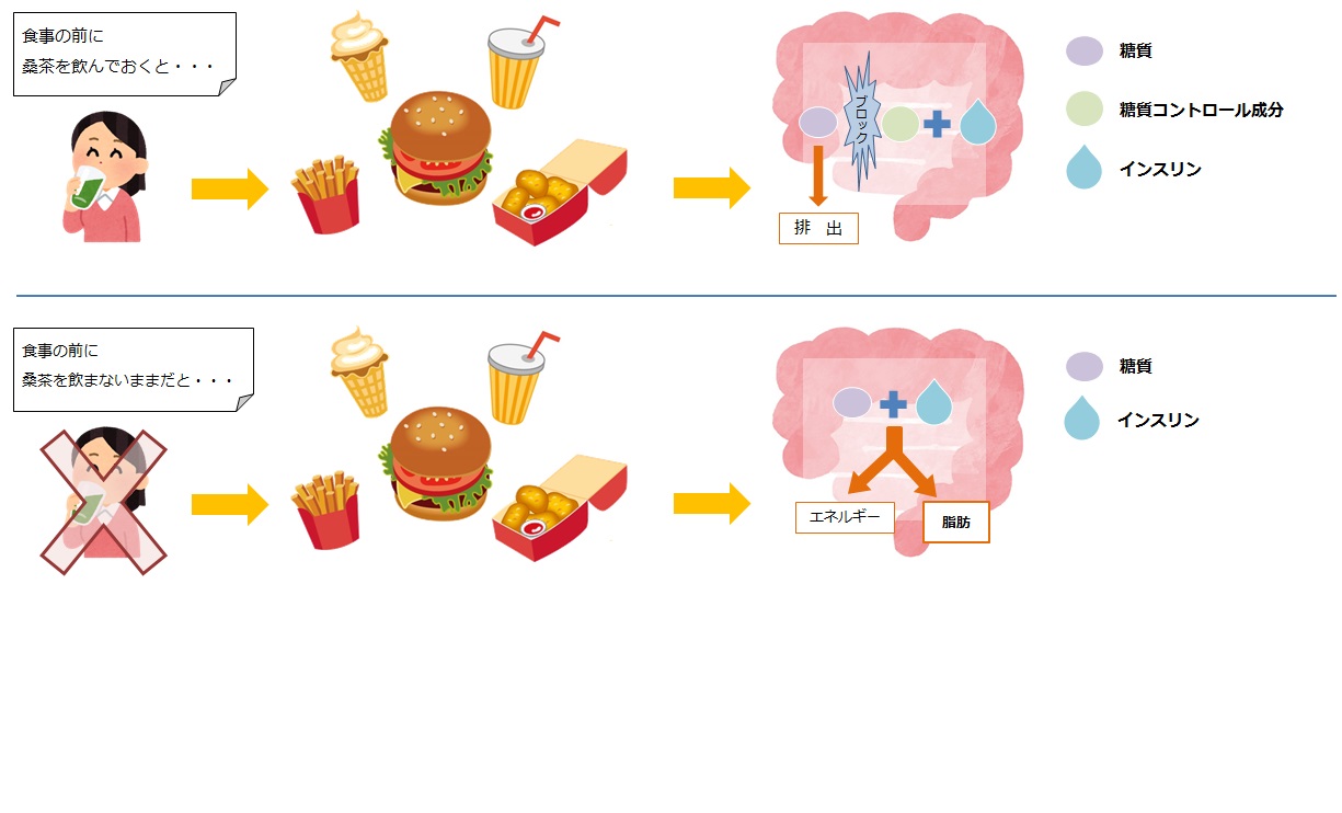 糖の分解・吸収を抑えるためには、糖質の摂取前に桑茶を飲用することがなにより重要です。*下図参照