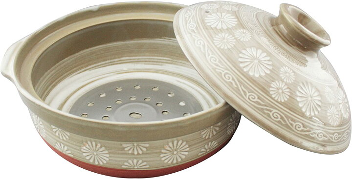 灰色菊柄の三島土鍋。ガス火、IH、レンジに対応しており ...