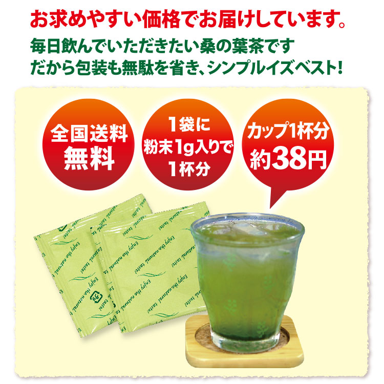 こちらの桑の葉は熊本県産100%!九州熊本の澄んだ空気と美味しい水で育ちました。完全無添加、無農薬で育てた桑の葉が原料です。粉末なので、お湯を注ぐだけで、いつでも気軽にご利用出来ます。栄養分も丸ごととれて無駄がありません。また、1杯分(1g)ずつ粉末を包装しましたので、どこでもお手軽にお持ちいただけます。