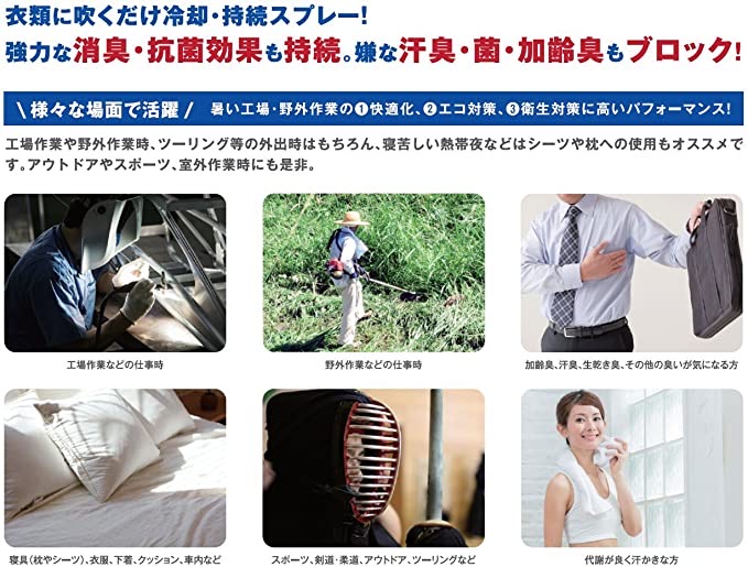 現場のプロが認めている本格派冷感スプレーである「SWEAT CLEAR」。魅力はなんといっても、強力な冷感効果とひんやり感覚の持続力です。冷感効果は約100分間持続するので、工場や野外など、熱がこもりやすい場所で作業時の熱中症対策としても効果抜群! また、銀イオン・亜鉛イオンが含まれているので、99.999%の除菌効果と菌の繁殖を防ぐ抗菌効果、汗の匂いの成分である「アンモニアガス」の消臭効果もあります◎ 加齢臭や汗のニオイを抑えるだけでなく、含まれるシトラスの香料で、ビジネスシーンやスポーツ中でも爽やかな印象を与えることができる万能冷感スプレーです!