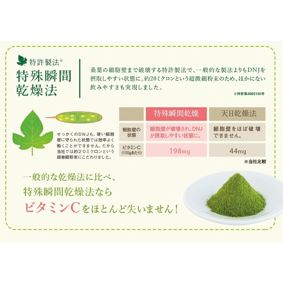 山本桑園の桑の葉茶は化学農薬を一切使わずに栽培した良質な桑の葉を使用しています。豊富な栄養をそのままお届けするため、桑の葉の細胞壁まで破壊する特許製法「特殊瞬間乾燥法」により、一般的な製法よりも糖質コントロール成分を摂取しやすい状態に。ビタミンやポリフェノール類などの栄養を極力減らさず生葉と変わらない新鮮さを保てるよう加工しています。約20ミクロンという超微細粉末のため、ほかにない飲みやすさも実現しました。